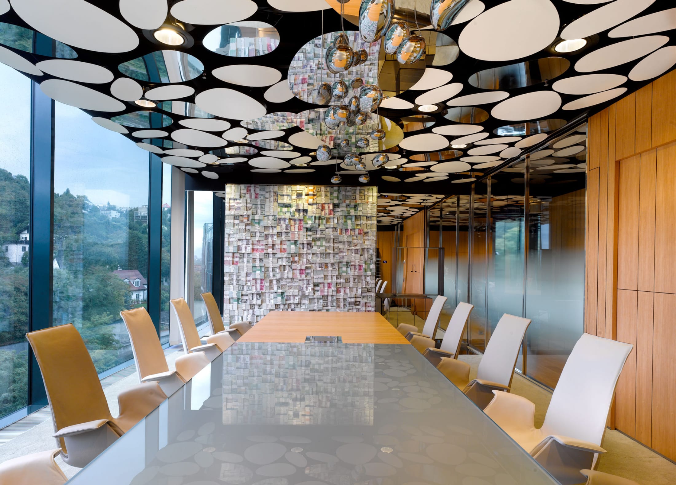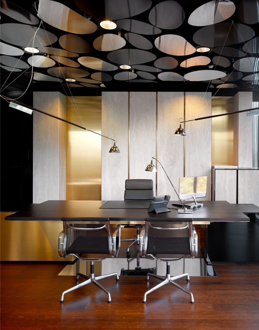 The opulent office space of J&T management was envisioned by Czech architect-designer Bára Škorpilová. Notable elements include the dark ebony wood matched with the sleek sheen of polished stainless steel. Natural travertine limestone meets artisanal melted glass, and high-quality leather further elevates the setting.