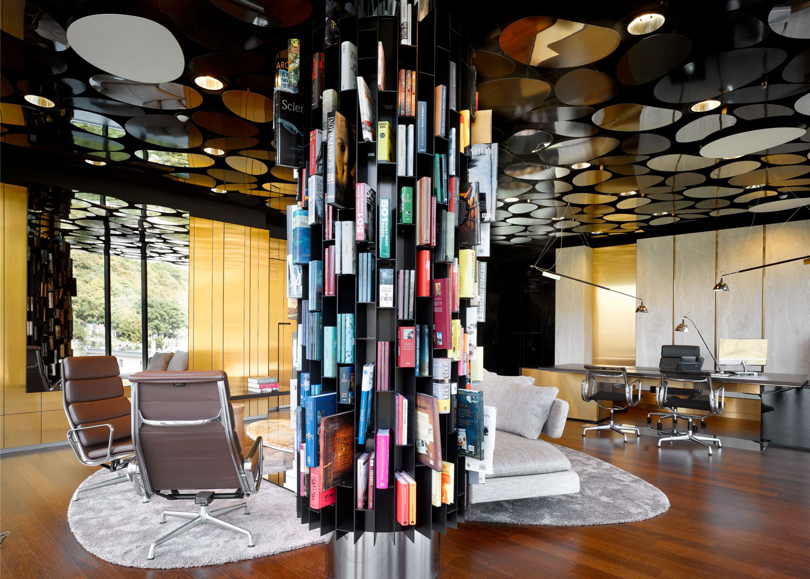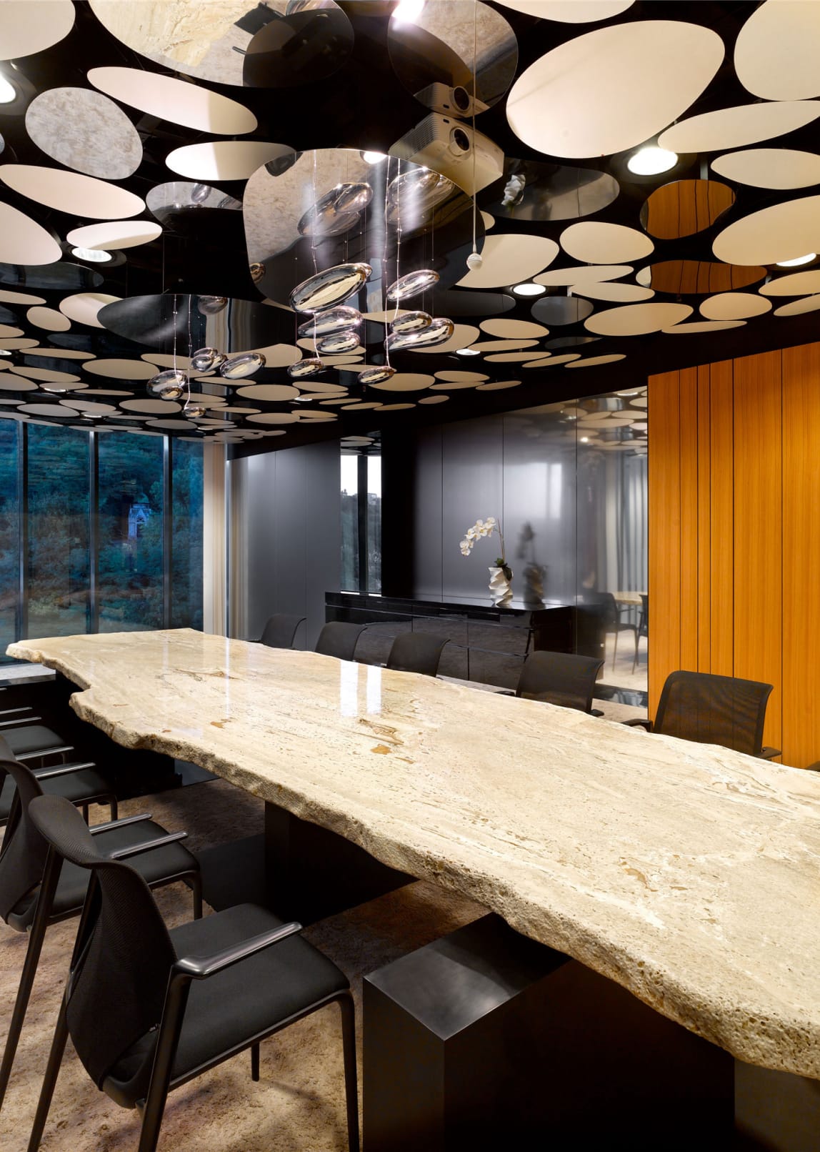 The opulent office space of J&T management was envisioned by Czech architect-designer Bára Škorpilová. Notable elements include the dark ebony wood matched with the sleek sheen of polished stainless steel. Natural travertine limestone meets artisanal melted glass, and high-quality leather further elevates the setting.